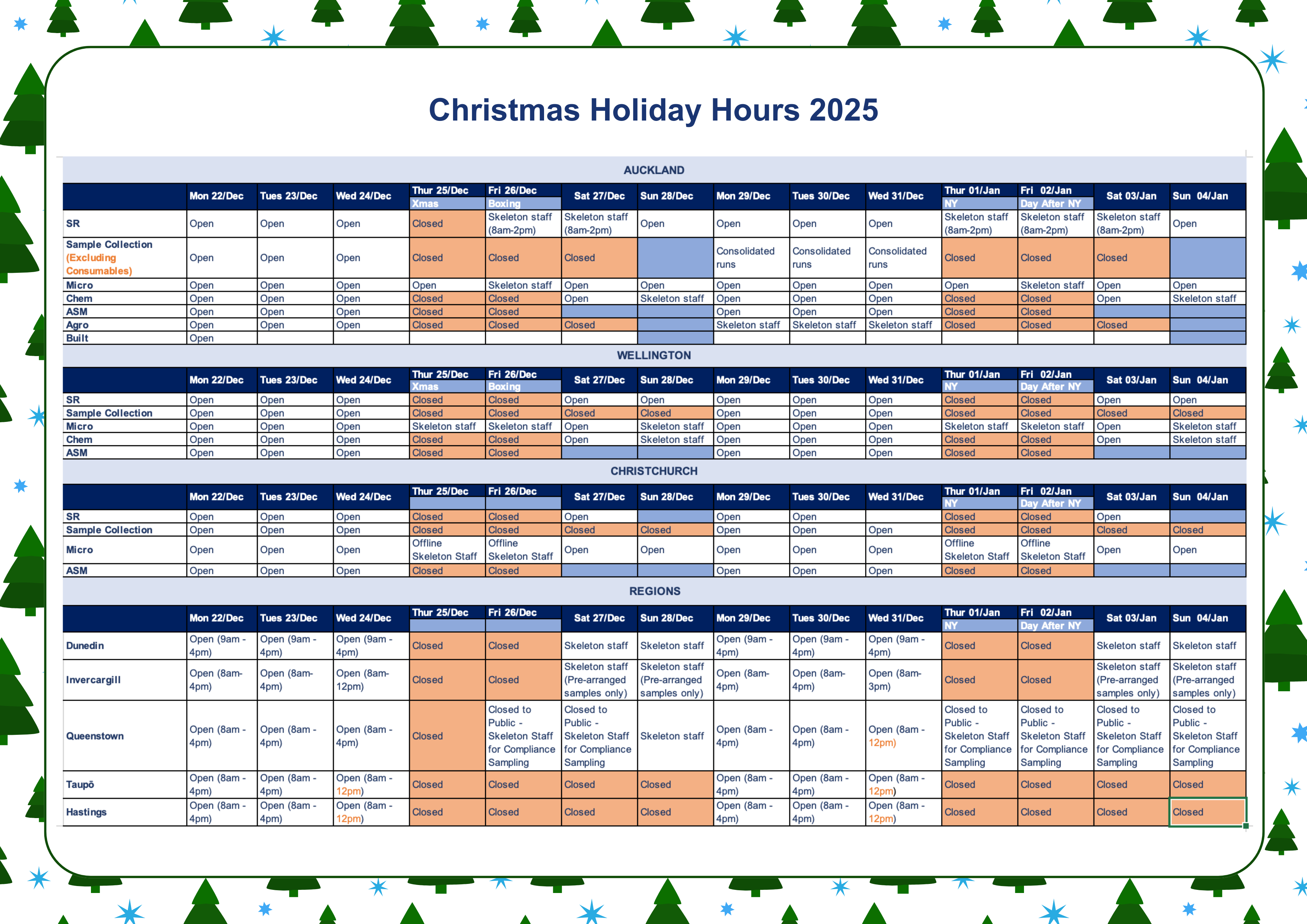All our laboratories will be open during the holiday season, but will be operating slightly reduced hours as outlined below and attached. If you have any specific questions relating to our services during this time, please direct these to your usual contact person or email ASMNZ@eurofinsanz.com. You can also reach our team on 0800 387 6367.